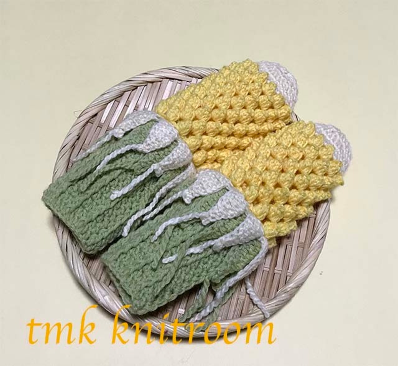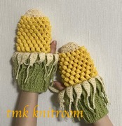 とうもろこしの形をしたかぎ針で編むミトンの作り方を掲載した