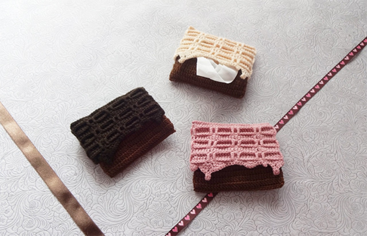 板チョコの形をしたかぎ針で編むポケットティッシュケースの作り方を掲載した