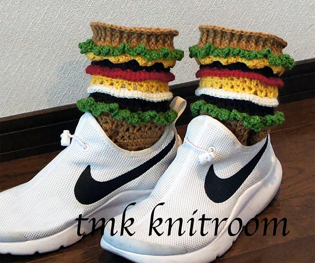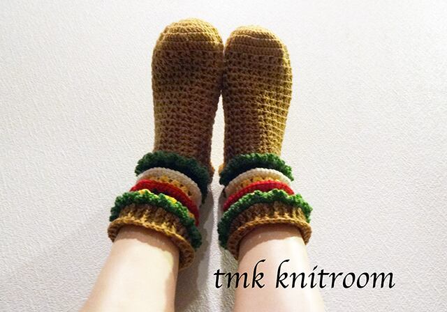 ハンバーガーの形をしたかぎ針で編むソックスの作り方を掲載した