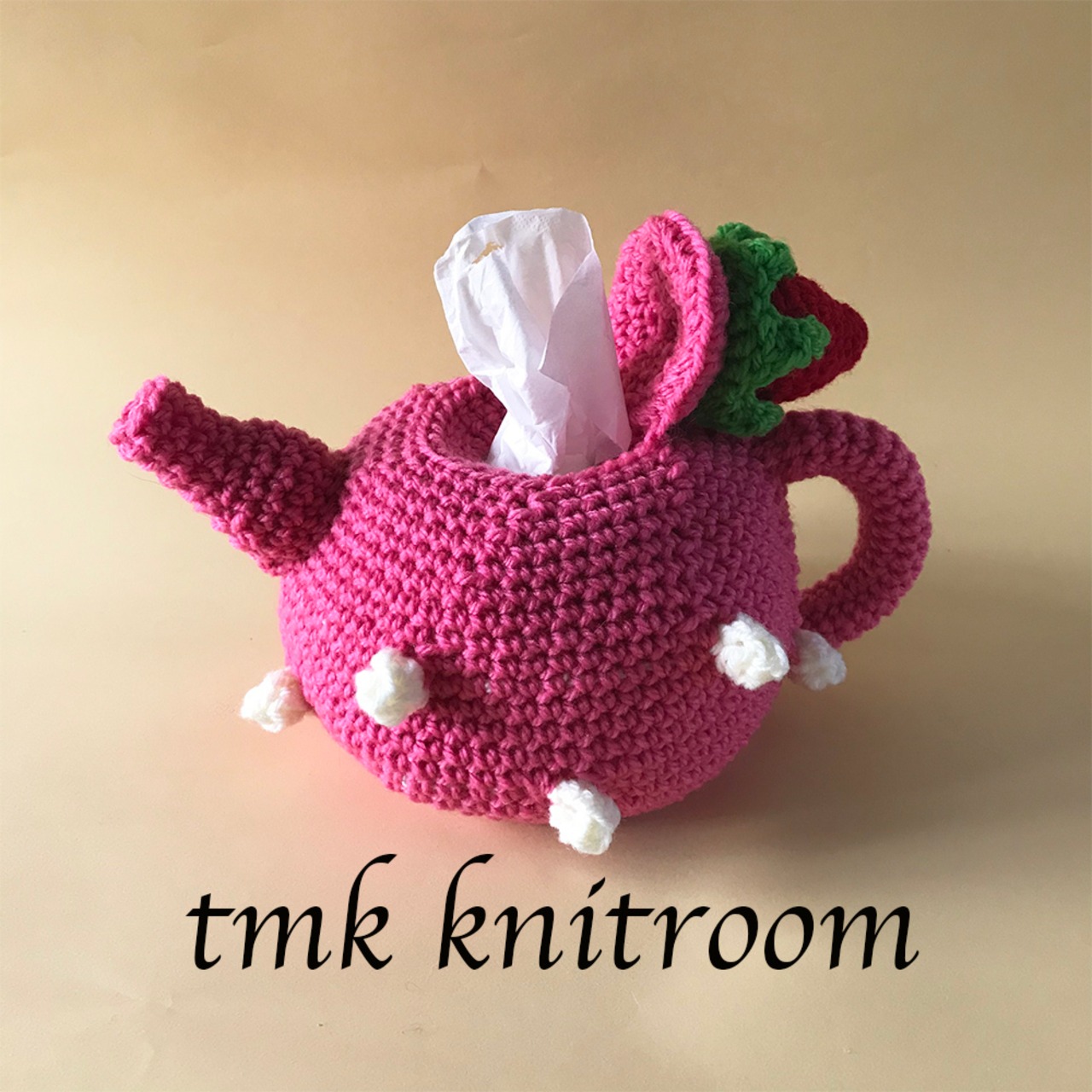 かぎ針で編む苺ティーポットの形をしたペーパーケースの作り方を掲載した