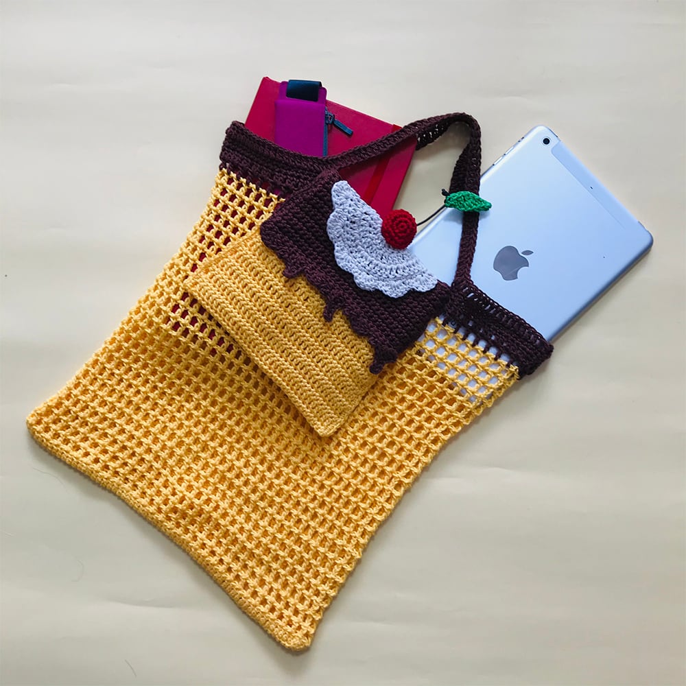 かぎ針で編むプリンの形をしたエコバッグの作り方を掲載した