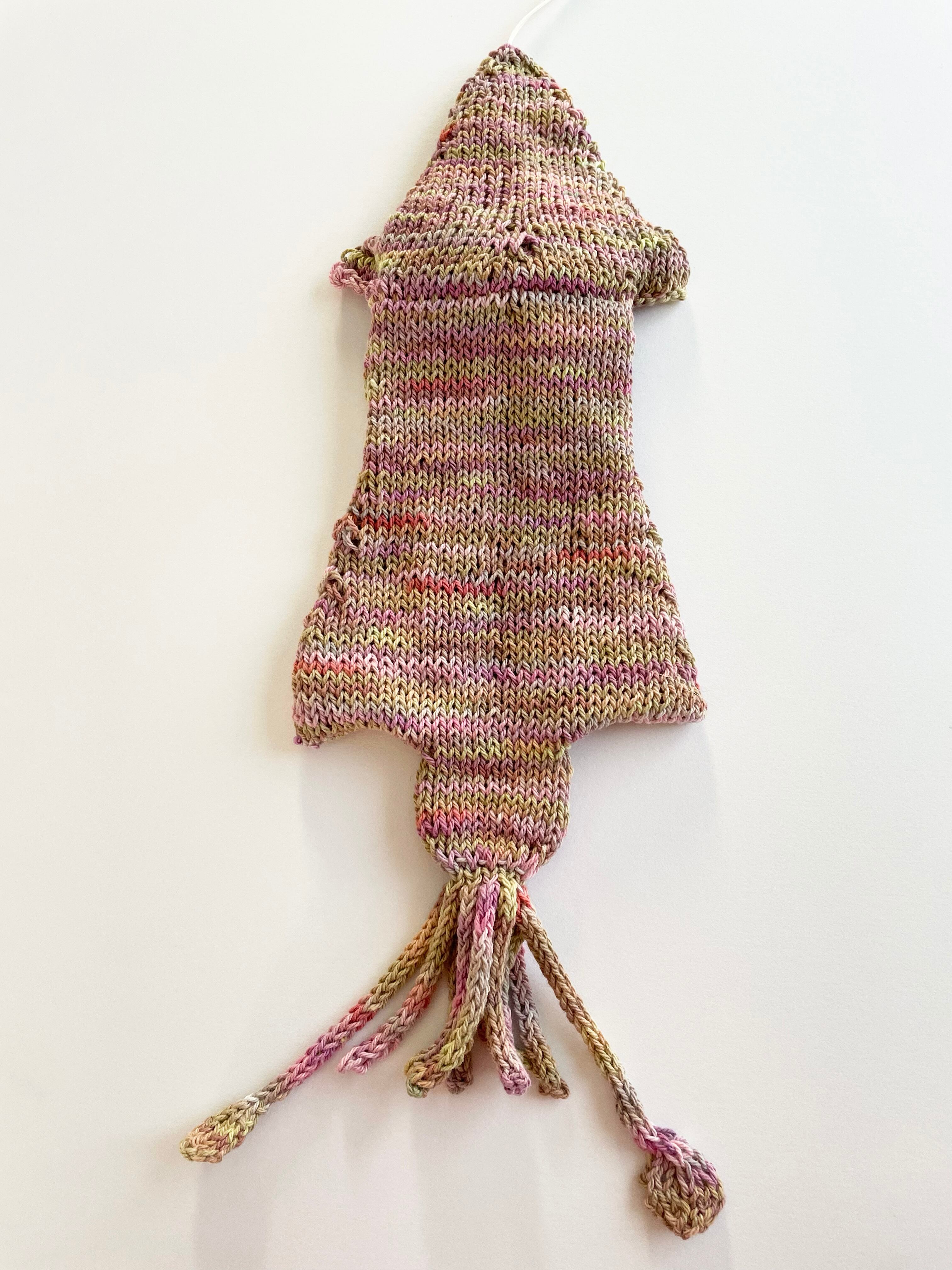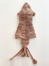 棒針で編むスルメイカの形をしたポーチの作り方を掲載した