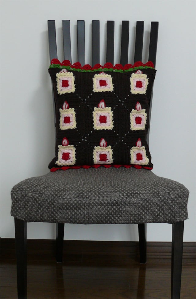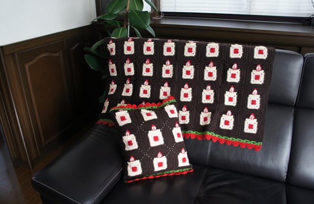 パティスリーのショーケースのようにケーキがきれいに並んだかぎ針で編むクッションとブランケットの作り方を掲載した「pdfダウンロード編み図」です。