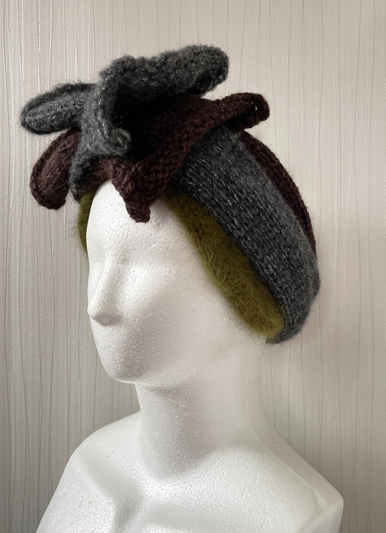 もちろん3色ではなく同じ色で編んでも構いませんし、頭を包む部分を2枚仕立てにすることも可能です。その辺の自由度も高い作品です。