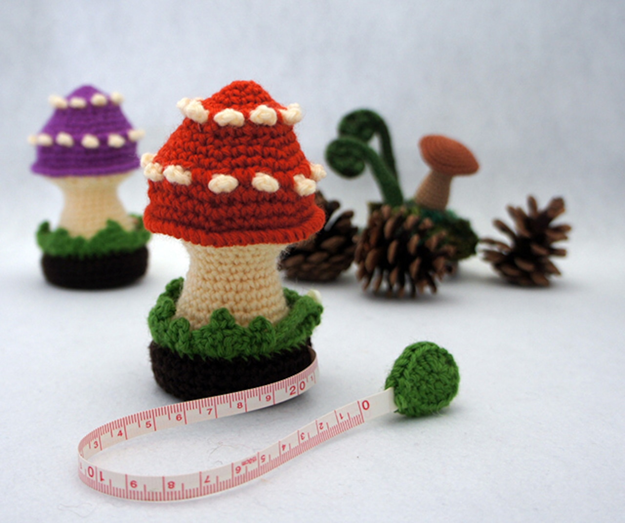 きのこの形をしたかぎ針で編むメジャー付きピンクッションの作り方を掲載した「pdfダウンロード編み図」です。