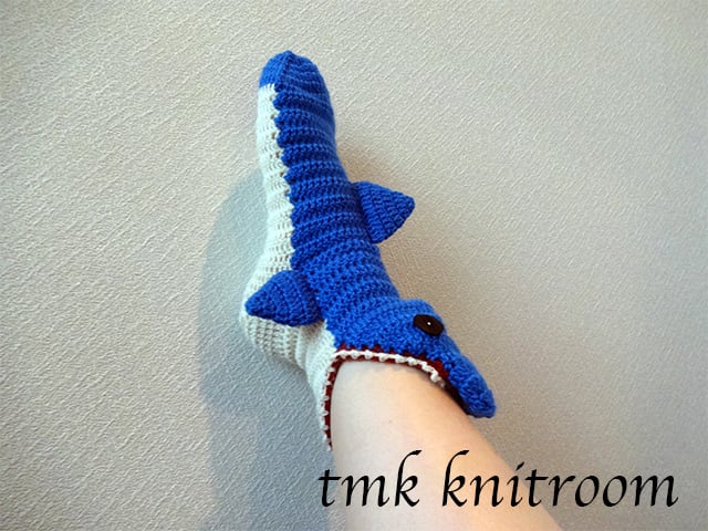 かぎ針で編む、大きな口を開いたサメ形ソックスの作り方を掲載した
